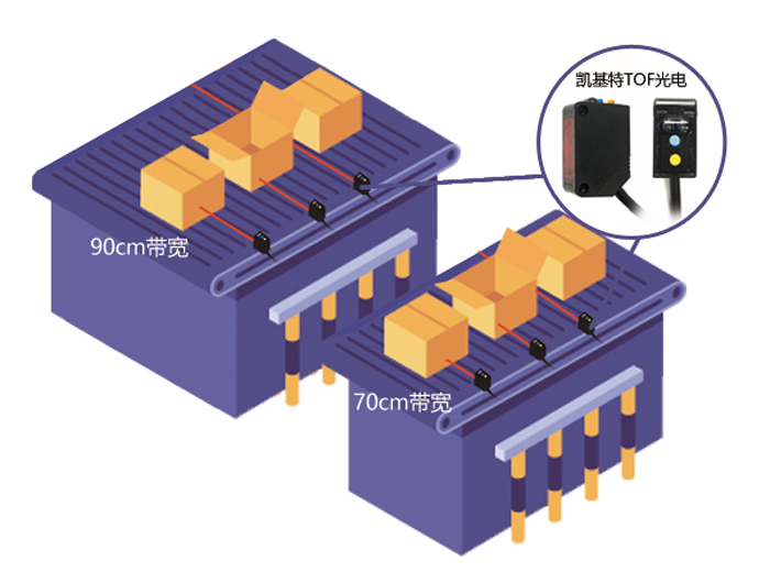 ▲一款產(chǎn)品搭建分支、合流搬運(yùn)線  ▲ 寬感應(yīng)距離,可用于各種輸送機(jī)線寬 以往,針對(duì)不同檢測(cè)距離需求,需配備不同的傳感器。但KJT-FG30具備30-4000mm的寬感應(yīng)距離,無(wú)需切換傳感器便可滿足不同感應(yīng)距離的需求。