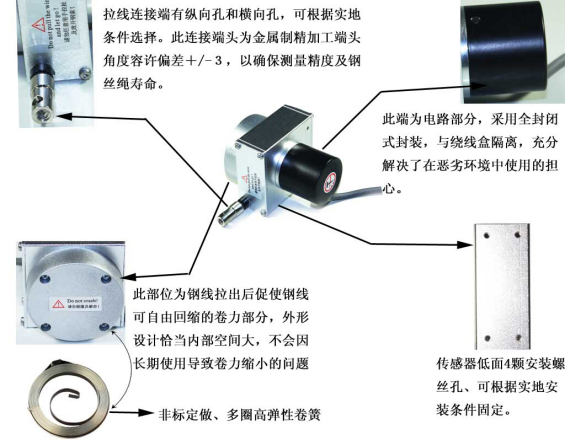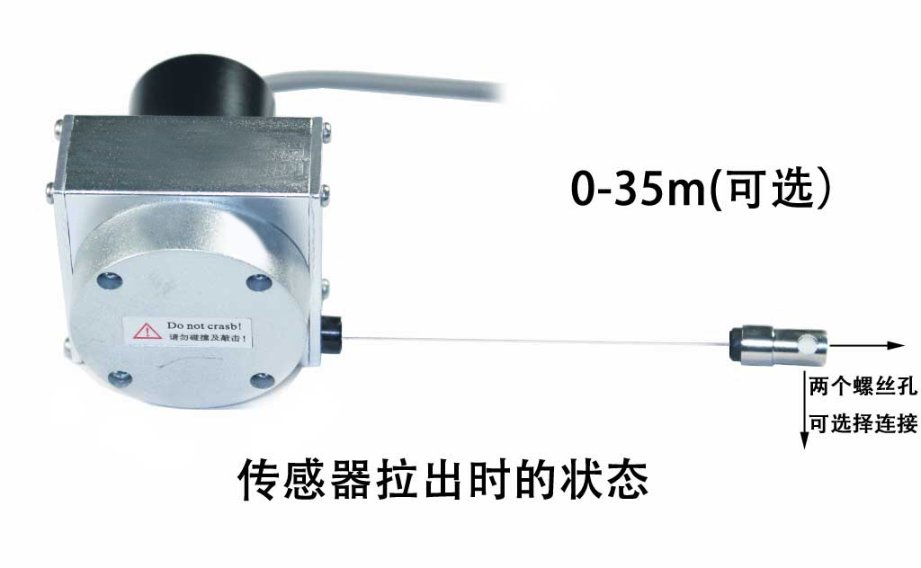 拉線位移傳感器可將機械位移量轉(zhuǎn)換成可計量的、成線性比例的電信號。當被測物體產(chǎn)生位移時,拉動與其相連接的傳感器繩索,繩索帶動傳感器傳動機構(gòu)與編碼器同步轉(zhuǎn)動;當位移反向移動時,傳感器內(nèi)部的自動回旋裝置將自動收回繩索,并在繩索伸收過程中保持其張力不變;從而輸出一個與繩索移動量成正比例的電信號。 傳感器具有獨立自動排線機構(gòu),保證拉伸繩自動均勻排線、保證傳感器具有高獨立線性精度和較長的傳感器使用壽命。